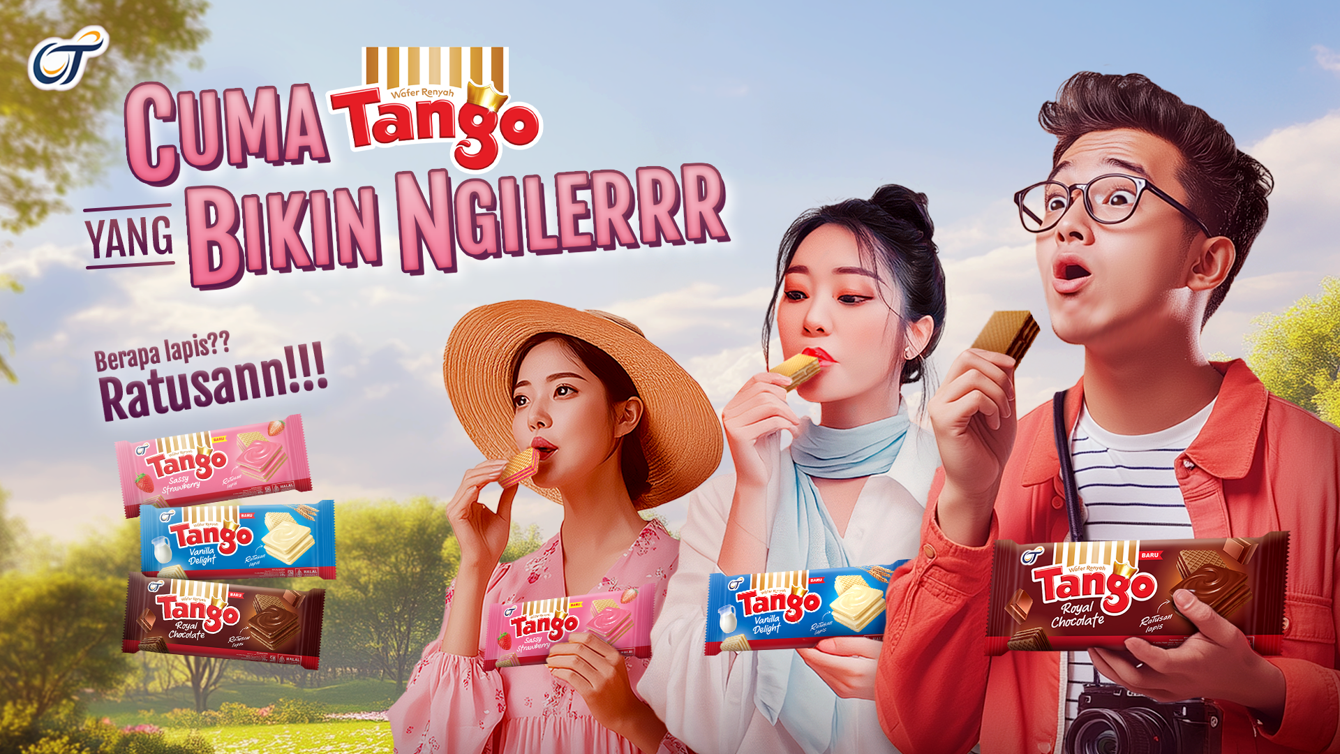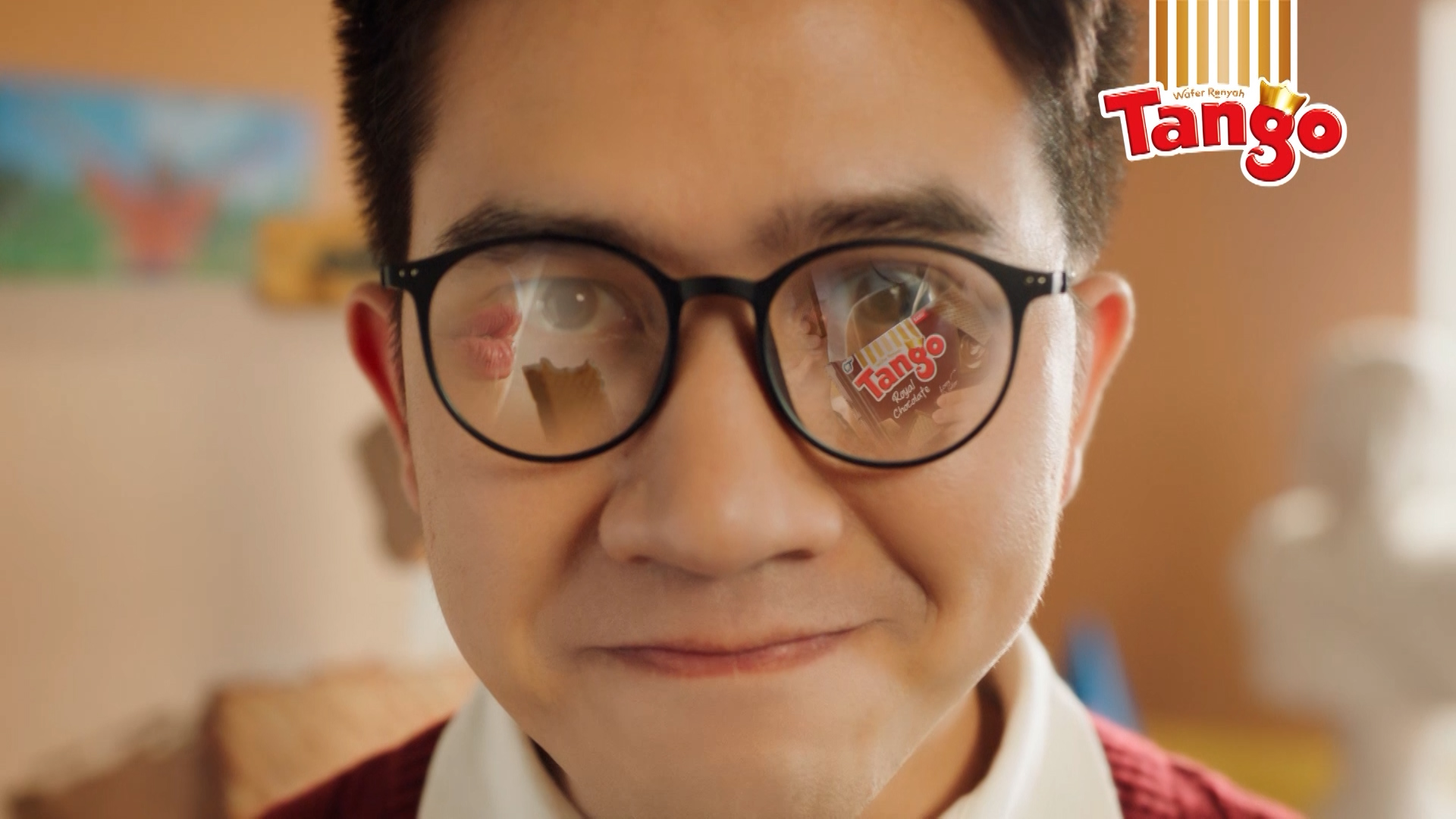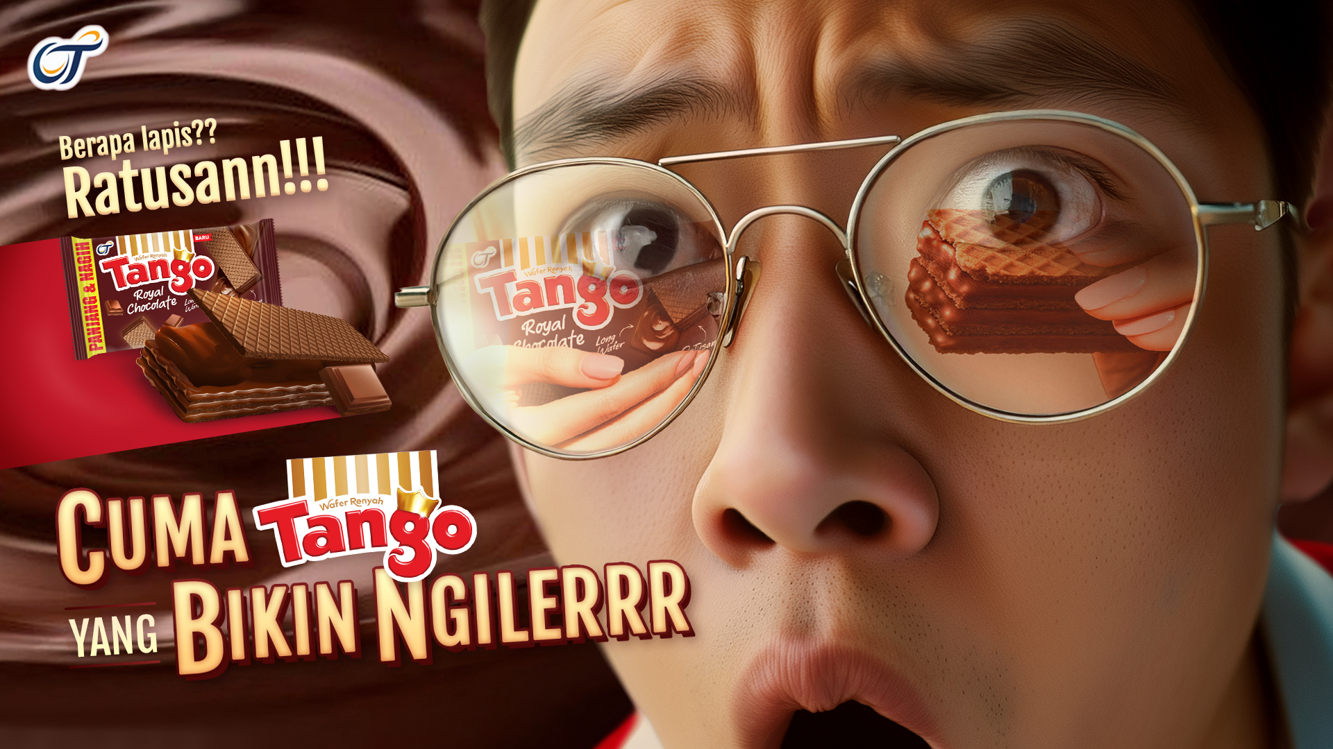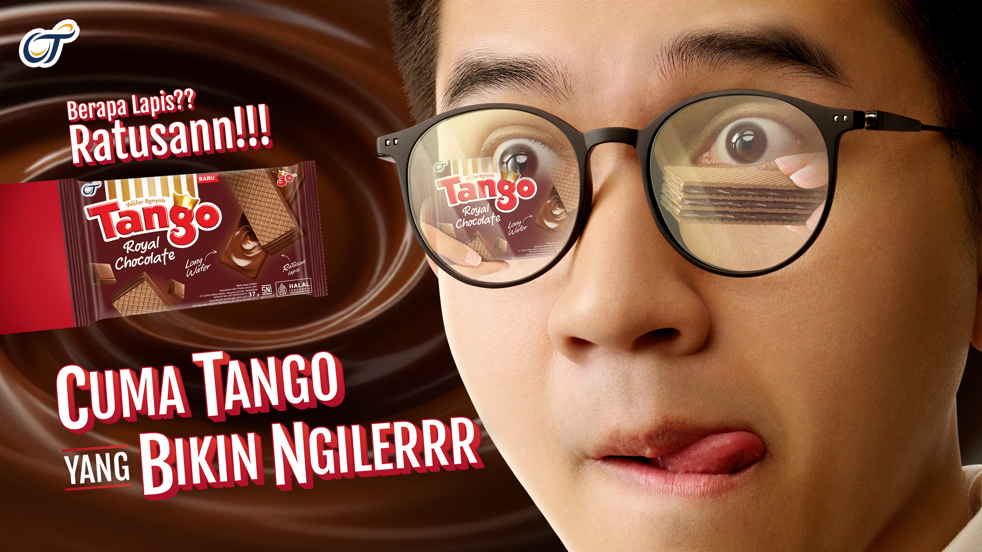 The key visual focuses on showing the craving/drooling expresion when seeing Tango Wafer Chocolate. The product itself can be seen on the reflection on the glasses. On the background, we use a 3D model of chocolate cream to show the yummy-ness of Tango Chocolate cream and intensify the chocolate ambiance.